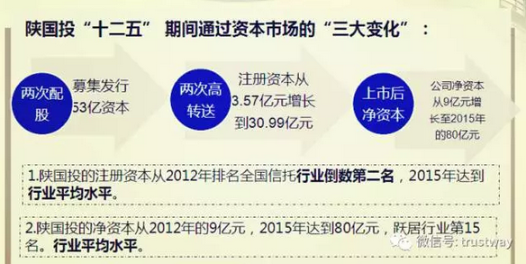 “2012年的時候,陜國投3.57億元的注冊資本在行業(yè)排名倒數(shù)第三。”薛季民感慨道,2015年,公司繼續(xù)把握住了資本市場階段性機會,完成了“十二五”時期的第二次增資擴股,募集資本32億元,再次實施十送十,使公司注冊資本達到了30.9億元,凈資產(chǎn)達到80億元,資本實力進入行業(yè)第一梯隊。