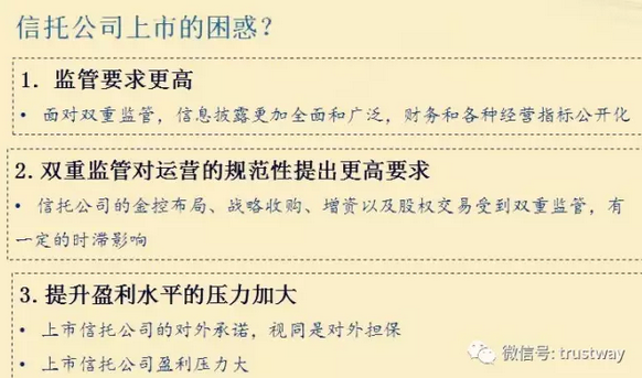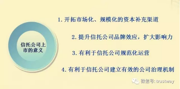 他認為,對于信托公司來說,上市不僅可以為信托公司開拓市場化、規(guī)范化的資本充足渠道,還可以提升品牌效應(yīng)擴大影響力,以及規(guī)范運營和建立有效治理機制。