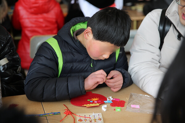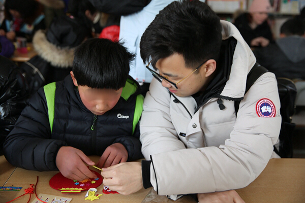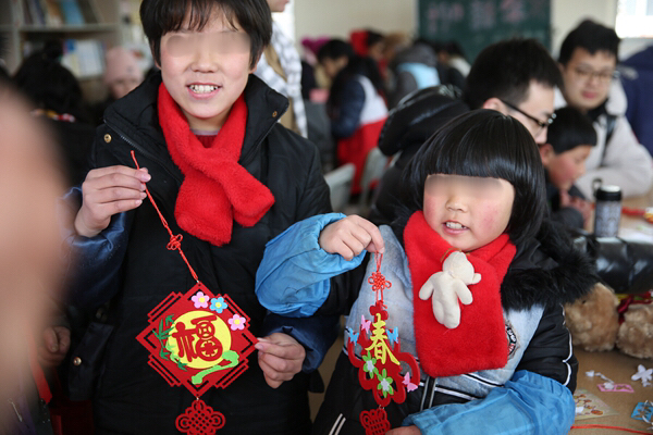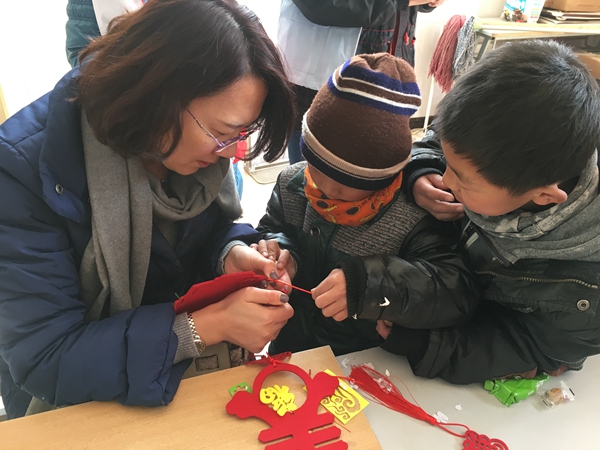 一大早,青年志愿者們便帶著精心準(zhǔn)備的小禮物和手工制作材料出發(fā)了,抵達(dá)兒童村時(shí)恰逢孩子們?cè)诙贞?yáng)光下活動(dòng)。青年志愿者們迅速融入,互動(dòng)唱歌、聊天、游戲后,為孩子們帶來(lái)了一節(jié)生動(dòng)的手工小講座,并與孩子們一起結(jié)對(duì)制作DIY新春賀卡、春節(jié)飾品??粗煺娴暮⒆佑瞄L(zhǎng)著凍瘡的小手認(rèn)真地在作品上寫下新春祝福,并將滿滿的心意回贈(zèng)時(shí),志愿者們被深深觸動(dòng),紛紛表示,愿意更盡一份心力,幫助更多不幸的孩子健康成長(zhǎng)!