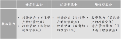 從地產(chǎn)基金價(jià)值鏈看,基金管理人需具備募集能力、投資能力、風(fēng)控能力和資管能力。這些能力在不同類型的地產(chǎn)基金中各有側(cè)重,但投資與資管一定都是最核心的能力要求。