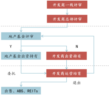 對(duì)于開發(fā)商拓展的項(xiàng)目,首先在基金層面對(duì)項(xiàng)目進(jìn)行評(píng)審,符合投資要求則由基金出資持有,否則由開發(fā)商出資并最終轉(zhuǎn)給基金。