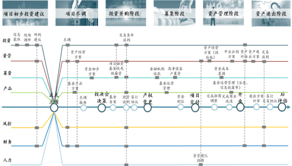 地產(chǎn)基金業(yè)務(wù)實(shí)操分為六個(gè)階段,即:初步投資建議階段、盡調(diào)階段、投資并購階段、募集階段、資產(chǎn)管理階段及退出階段。