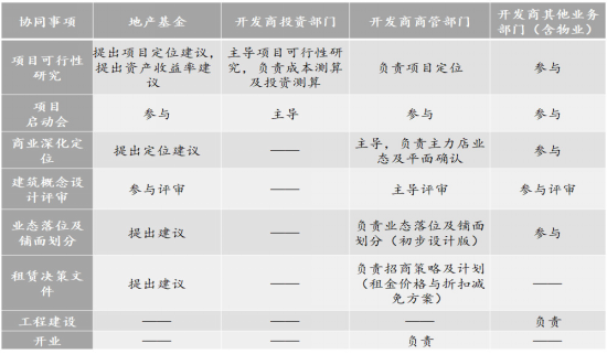 其中,基金與商業(yè)開發(fā)關(guān)鍵協(xié)同點(diǎn)主要在商業(yè)項(xiàng)目定位、投資決策及開業(yè)前期,通過對(duì)項(xiàng)目定位、租賃決策等核心決策事項(xiàng)的參與,保證后期資產(chǎn)改造成本最低。