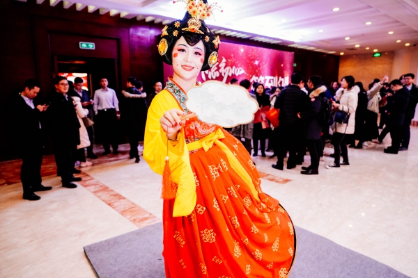 活動(dòng)開(kāi)始,不倒翁小姐姐身著唐服,隨著歌曲《神話》的旋律,輕歌曼舞,帶著大家一起回到盛世大唐。演出現(xiàn)場(chǎng)光彩奪目,歡樂(lè)喜慶。