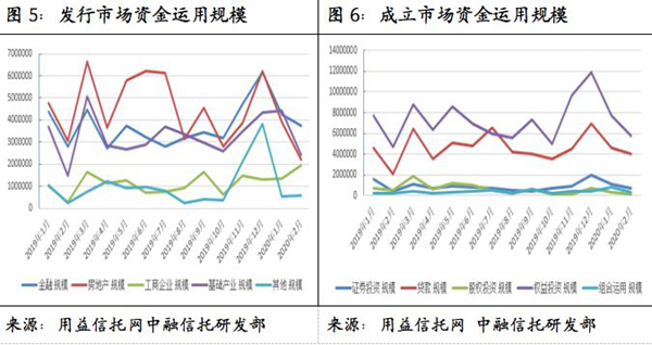 相較于基礎(chǔ)產(chǎn)業(yè)類信托,金融類信托受到疫情影響相對較小,其主要投向的信托、消費(fèi)金融等領(lǐng)域?qū)τ谛磐泄径哉箻I(yè)更加容易判斷,更易通過遠(yuǎn)程化、電子化進(jìn)行開展,因此在2月取得一定增長也是市場合理選擇后的結(jié)果。
